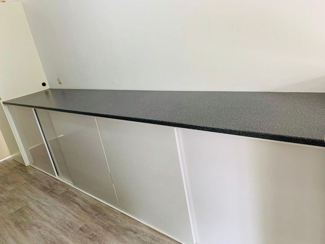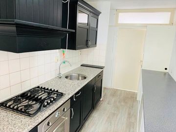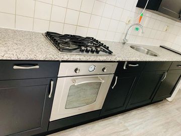 You enter the open kitchen through the living room. Spacious kitchen with an oven, stove and extractor.