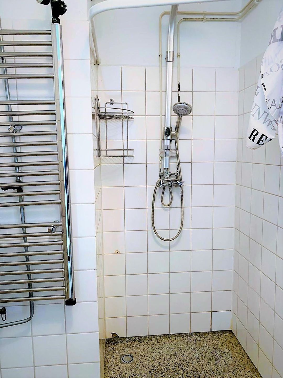 Eenvoudige , badkamer, voorzien van douche, wastafel met wastafelmeubel.