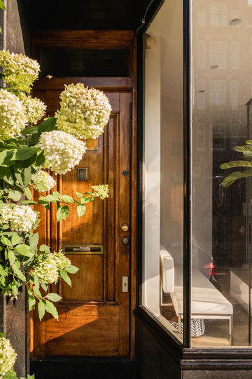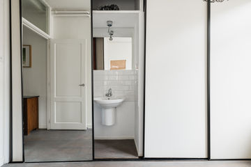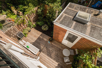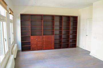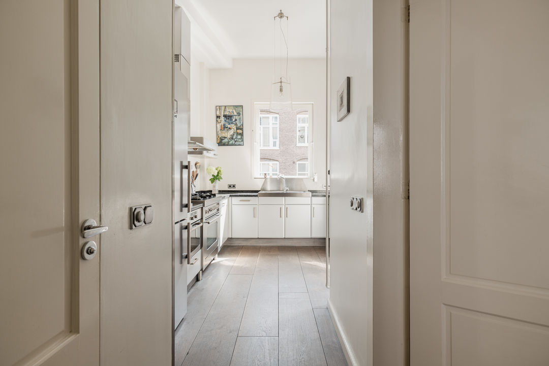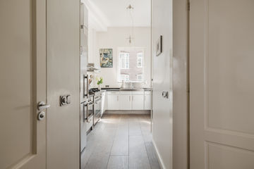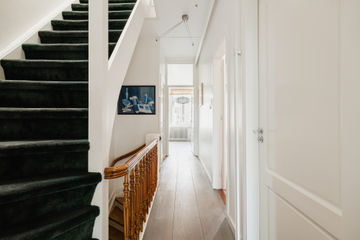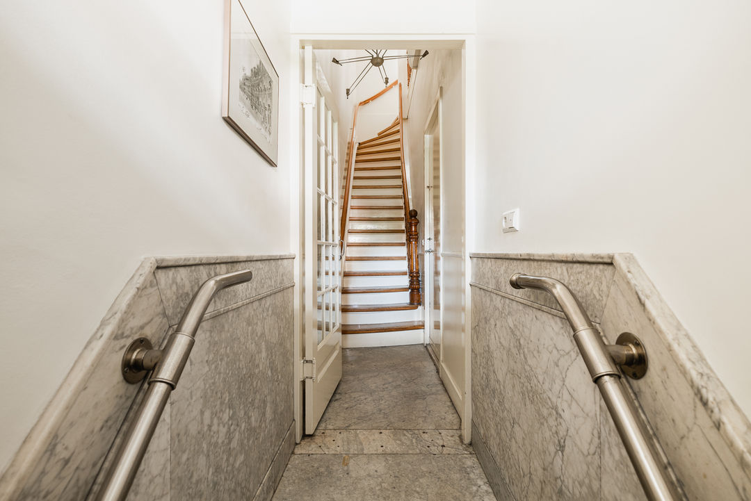 Private street-level entrance with stairs to the first floor. Spacious living space with the living room at the front with ceiling heights of over 3.50 meters. At the front, French doors lead to a small balcony, offering a lovely view of the leafy surroundings. At the rear, a dining room that opens to a ca. 8 sqm south-facing terrace. The kitchen is also at the rear. Guest restroom off the hall.