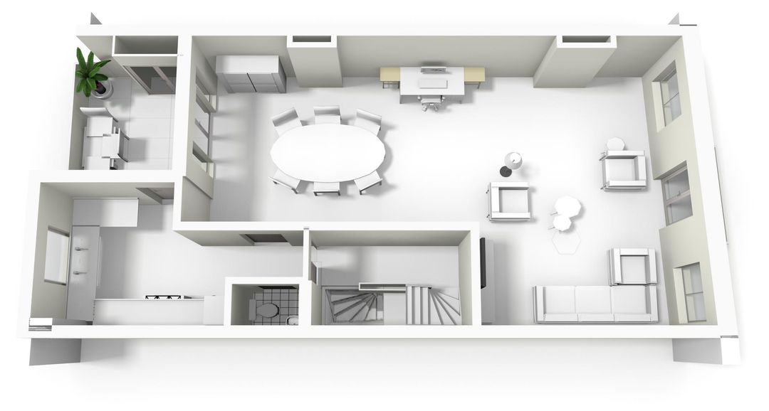 The third floor features a vast open-plan space that can be used as a study, large bedroom or can be divided into individual rooms. At the front is a large glass facade with a stunning view of the surroundings, and opening to a roof deck. This level also includes two restrooms and a laundry room/ kitchen. One of the restrooms can be converted into a shower room.