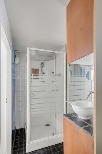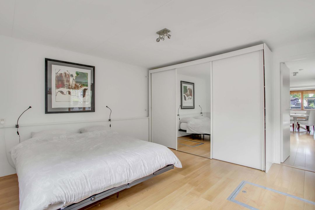 Layout: You enter the houseboat in the kitchen area. The kitchen is fully equipped. Oven/microwave, fridge-freezer, dishwasher and built-in gas hob. An Intergas central heating boiler from 2017 is nicely concealed in a kitchen cupboard. The kitchen area is separated from the living room by a bar. The living room has a sitting area and there is room for a dining table. The bedroom is spacious, with large closets. The bathroom is located in the middle of the houseboat and has a shower, washbasin and toilet. In the storage cupboard are the washing machine and dryer. The second bedroom can easily be added to the living room thanks to the handy sliding door. On either side of the houseboat is 4.5 meters of free water, where your own boats can be moored. The houseboat is hidden behind a wide strip of plants and trees; you can sit there spacious.