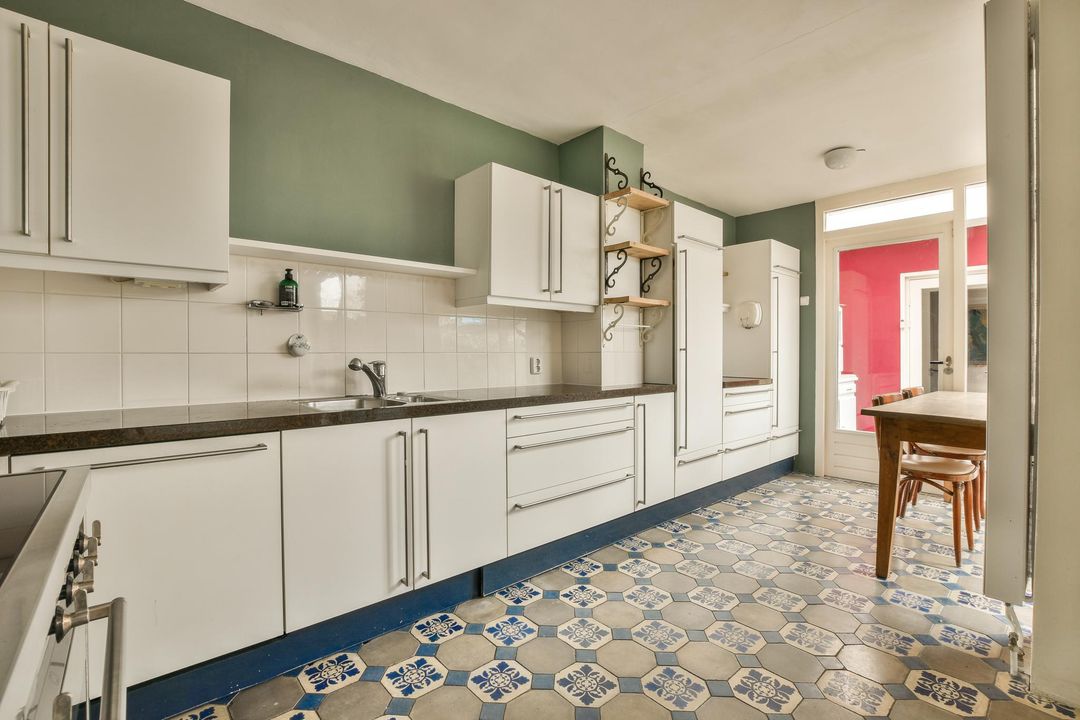 De open keuken bevindt zich aan de zijkant van de woning. Nette witte keuken met een graniet aanrechtblad en met diverse inbouwapparatuur; inductie kookplaat en grote oven met afzuigkap, vaatwasser, koelkast. Achter de keuken is nog een bijkeuken, die is gecreëerd door de uitbouw. Vanuit deze uitbouw is de bijkeuken bereikbaar met de wasmachineruimte en droger, daarachter de berging en niet te vergeten de inpandige toegang tot de garage. Ook vanuit deze ruimte is het zijpad en de tuin bereikbaar.