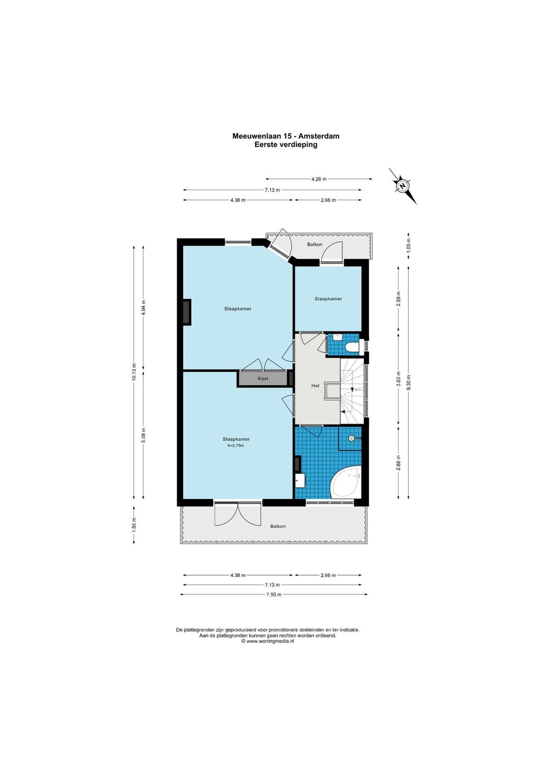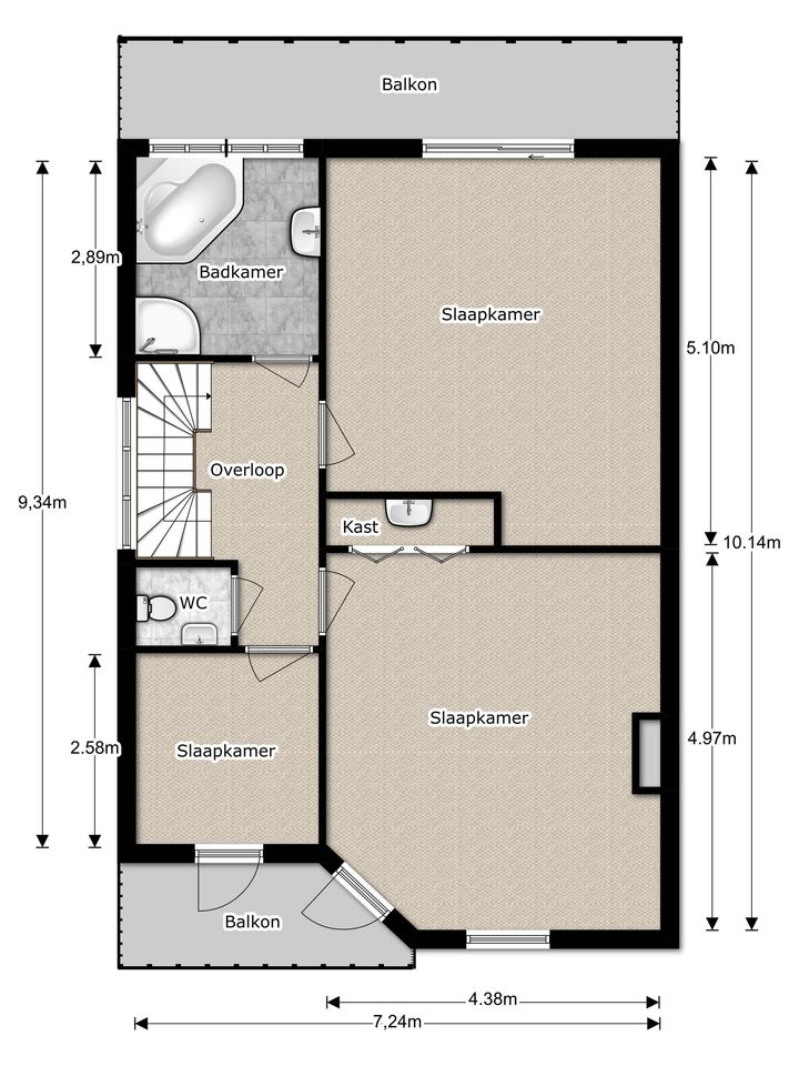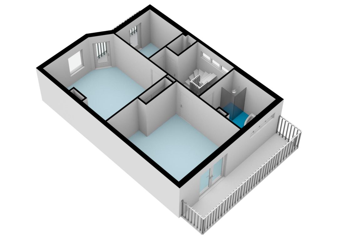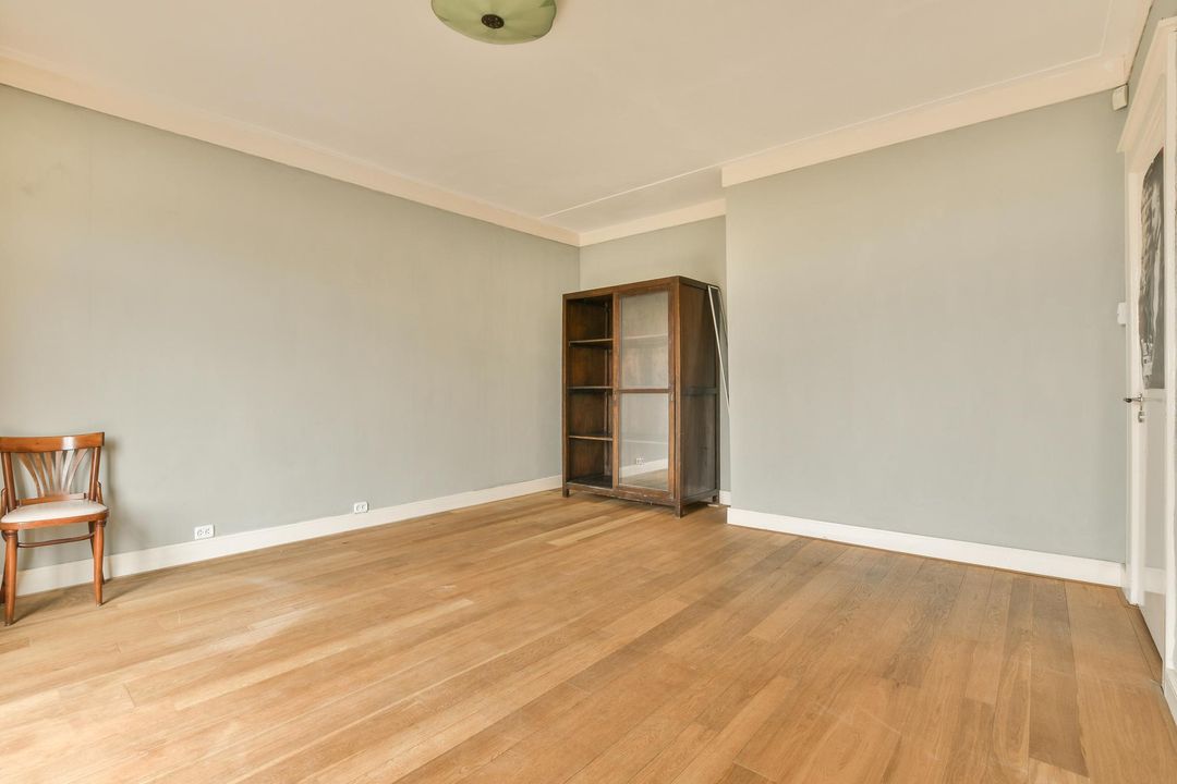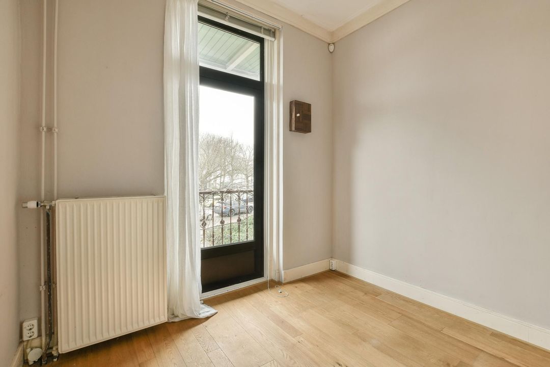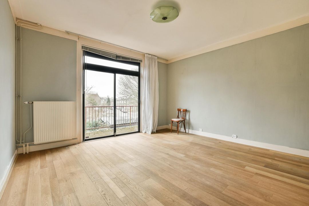 Ruime overloop. Master bedroom aan de achterzijde met een grote kast en een schuifpui naar het balkon over de gehele breedte van de woning. Tweede ruime slaapkamer aan de voorzijde van de woning. De derde kleine slaapkamer is zeer goed geschikt als werkkamer. Beiden kamers bieden toegang tot het balkon aan de voorzijde. De eerste verdieping is afgewerkt met een mooie houten vloer.