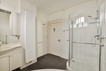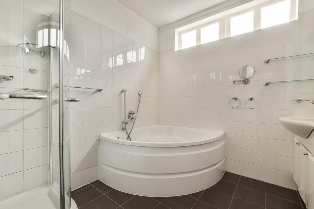 Nette badkamer met een hoek ligbad, douchehoek met thermostaat kraan, wastafelmeubel en natuurlijke lichtinval. Separaat het tweede wandcloset met fontein.