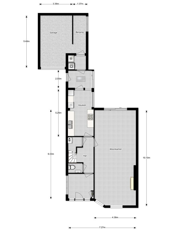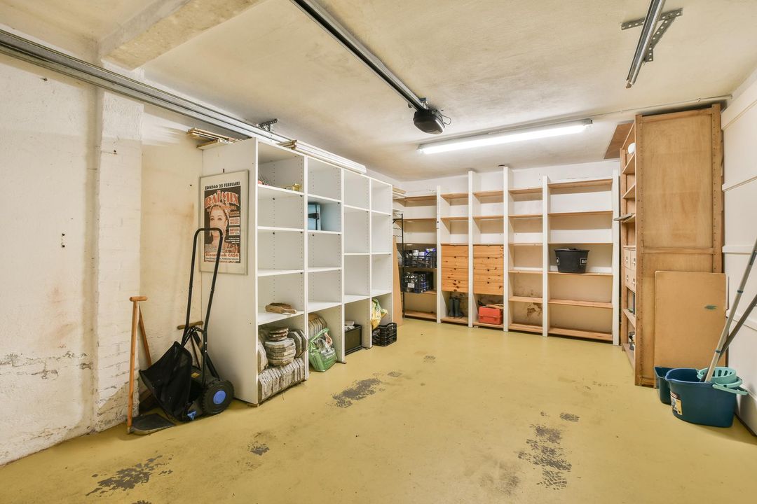 Stenen garage aan de zijkant van de woning met een elektrische deur, voorzien van licht en elektriciteit. De garage is vanuit het huis te bereiken.