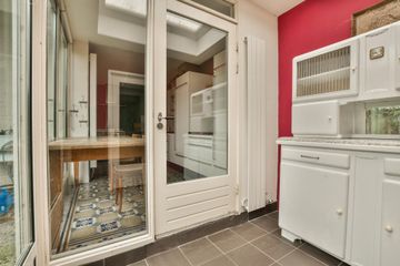 The open kitchen is located on the side of the house. Neat white kitchen with a granite counter top and various built-in appliances; induction hob and large oven with extractor hood, dishwasher, fridge. Behind the kitchen is another utility room, which was created by the extension. From this extension, the pantry is accessible with the washing machine and dryer, behind it the storage room, not to mention the indoor access to the garage. The side path and the garden can also be reached from this room.